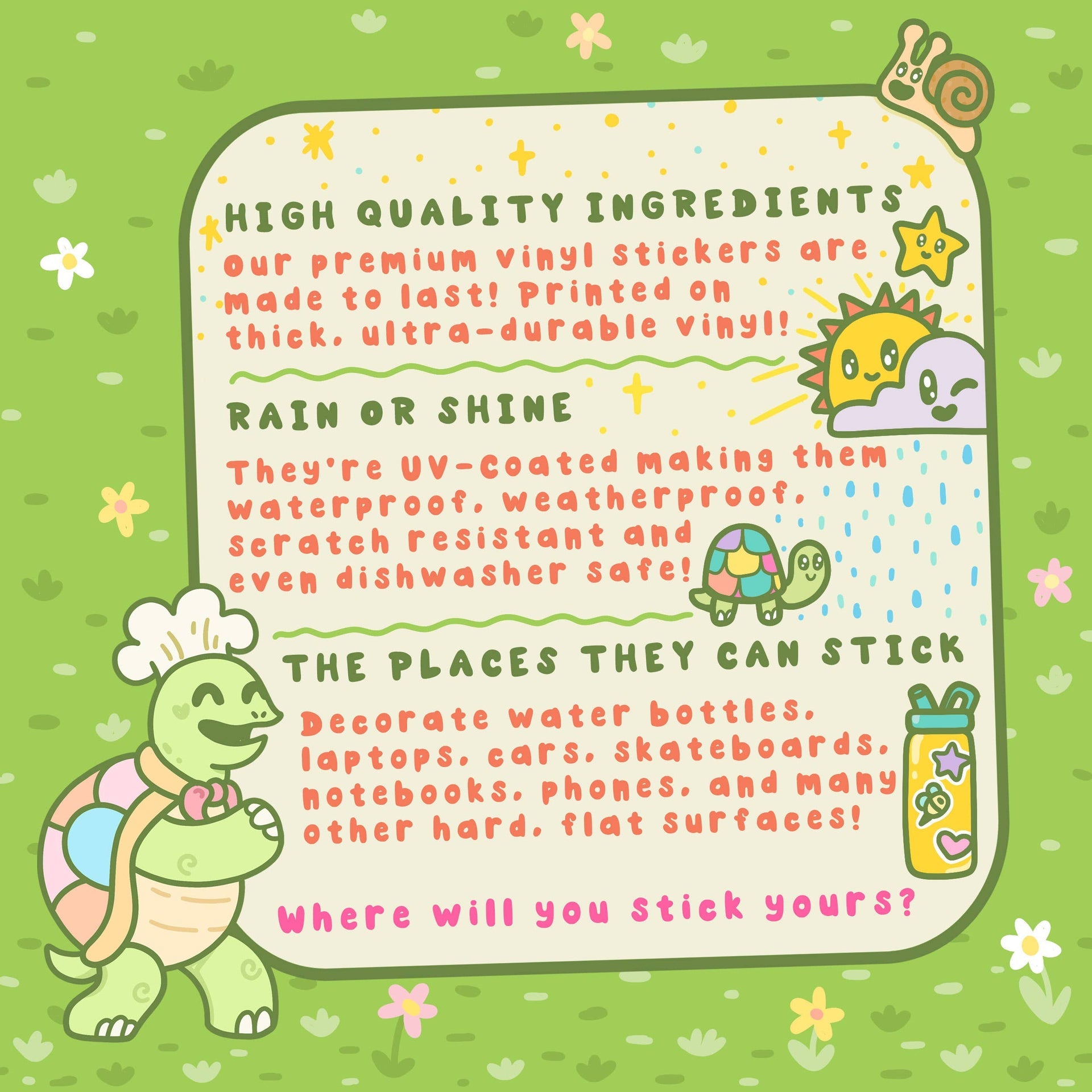 🐢 Нашите винилови стикери „Turtley Awesome“ са направени от най-висококачествените съставки на пазара! Отпечатани върху дебел, ултра-издръжлив винил, тези стикери са създадени да издържат. Тяхното анти-UV покритие ги прави водоустойчиви, устойчиви на атмосферни влияния и подходящи за съдомиялна машина!