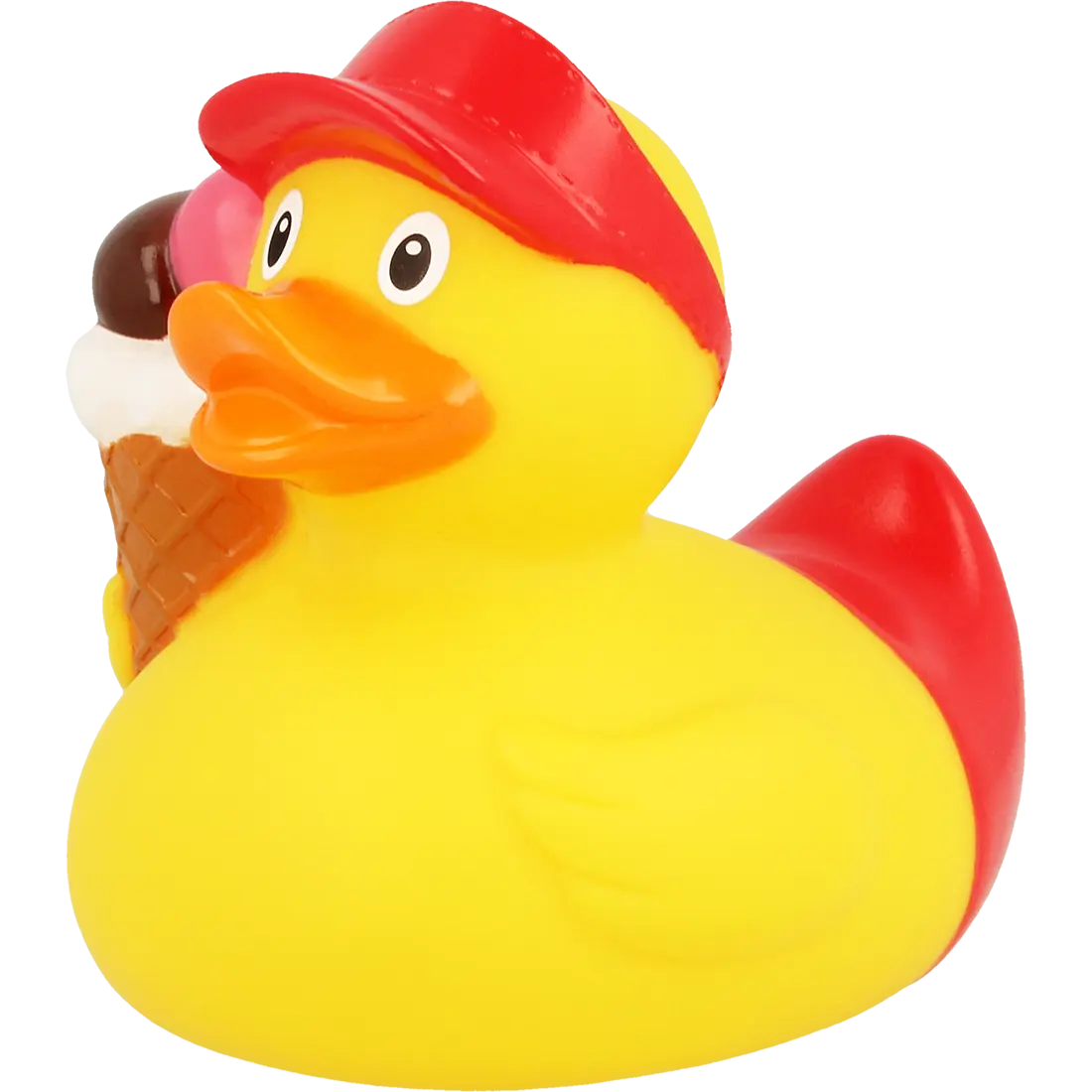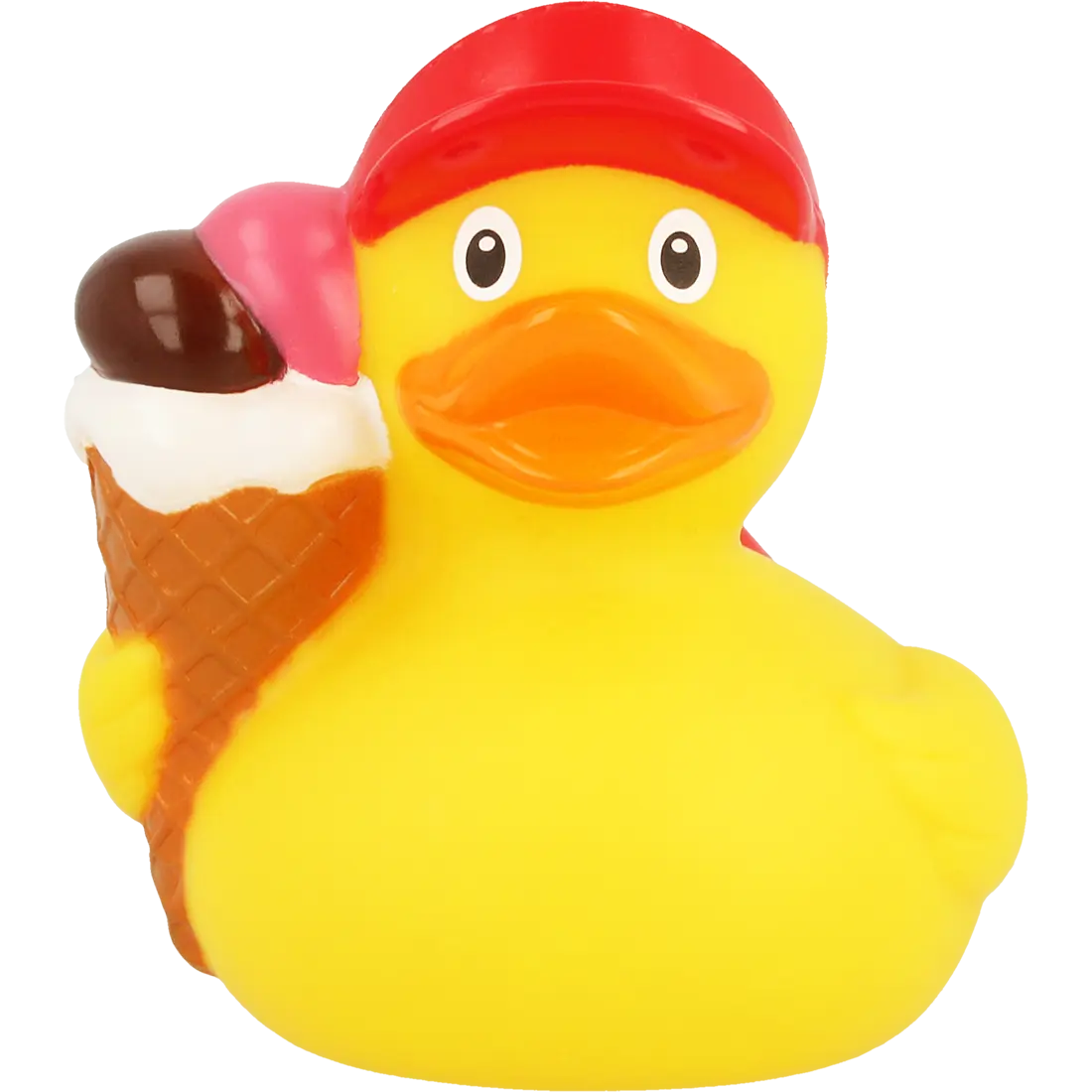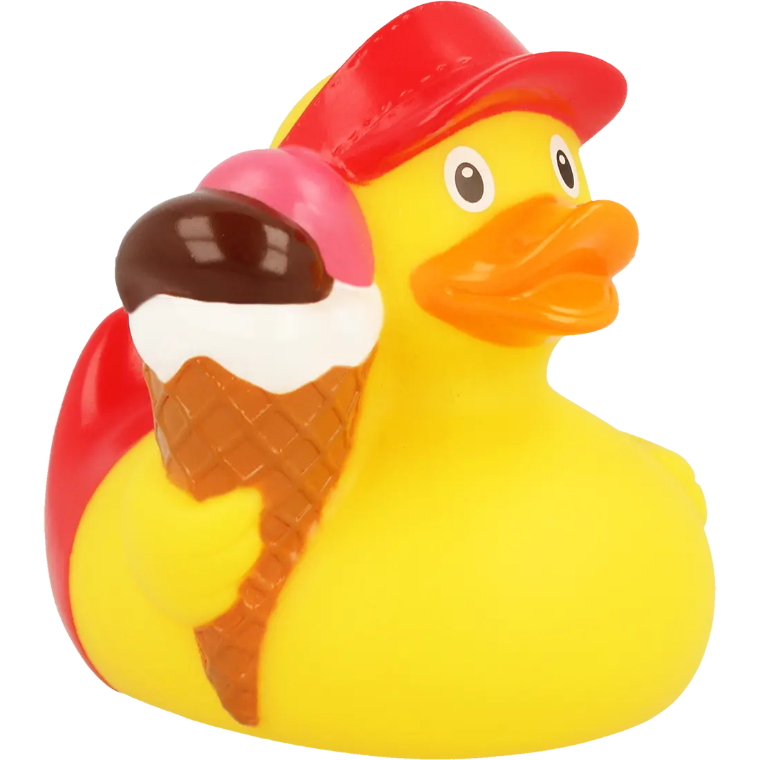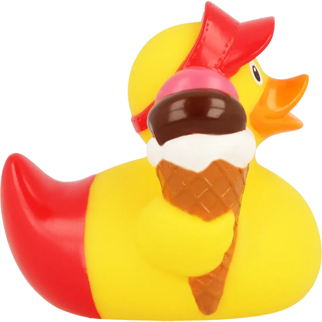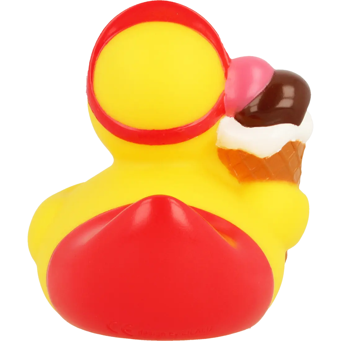 I den perfekte sommerstemning: and med is. Med en sommerhue på hovedet og en lækker is i hånden kalder hun på solen og får dig til at længes efter den varmeste årstid. En garanti for godt humør på regnfulde dage og en ideel ledsager til svømning og padling!
