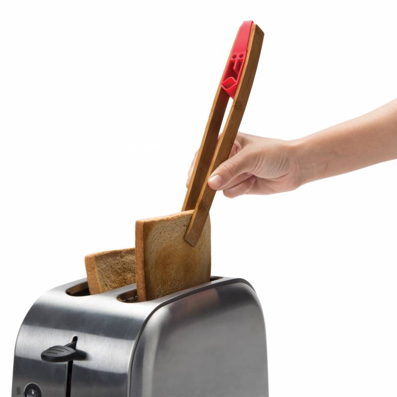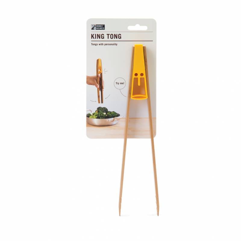 Stop faren ved gaflen i brødristeren...King Tong er en simpel køkkentang, men med sit bambushåndtag kan den redde dit liv! Denne tang er et multifunktionsværktøj. Foran dit komfur, til at servere din salat... Du vil have mange muligheder for at bruge den. Plasticdelen af tangen kommer til live med hver klemme, hvilket får ansigtet på den til at smile eller grimasse.