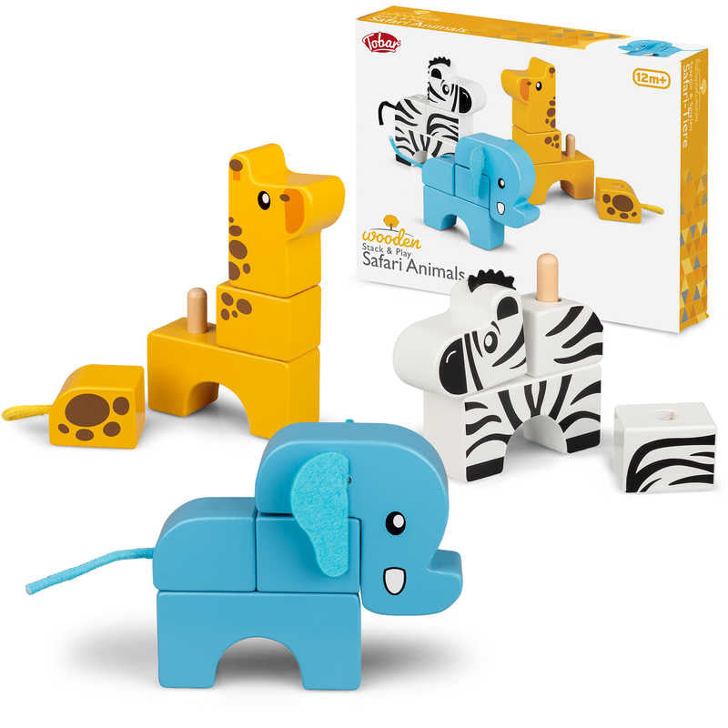 Stak og spil Safari-dyr inkluderer alle blokkene til at bygge tre vilde dyr.