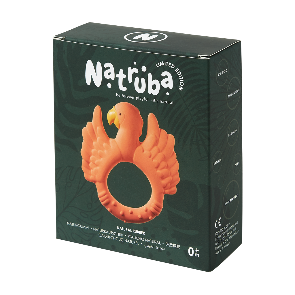 Papegøjen Natruba - limited edition farve - er let for små hænder at gribe og perfekt lindring mod ømme gummer. Papegøjen har forskellige overflader til sanseleg og har både blødt og hårdt naturgummi til at tilfredsstille alle stadier af ømme tandkød. Den lyse farve stimulerer dit barns syn.