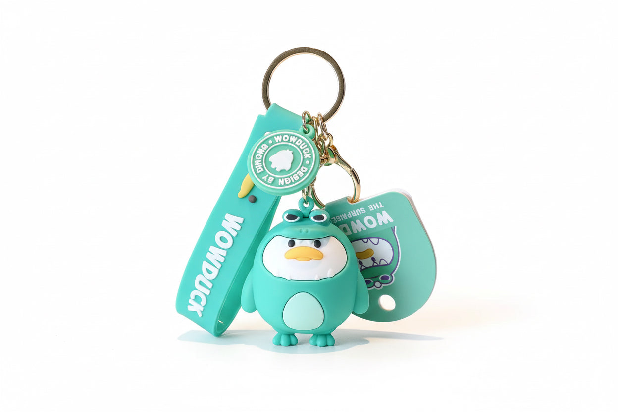 Weißer Enten-Schlüsselanhänger, getarnt als grüner Dinosaurier