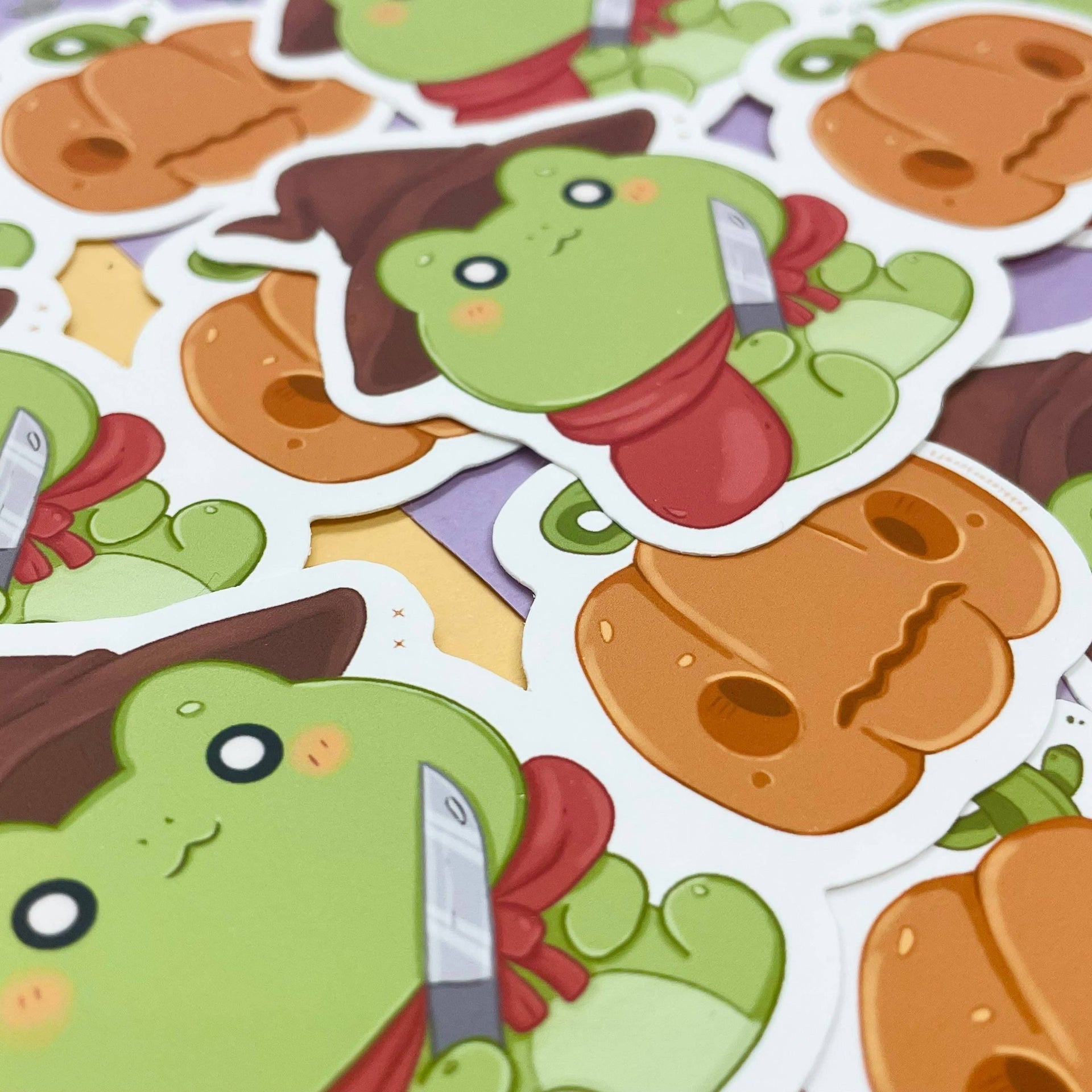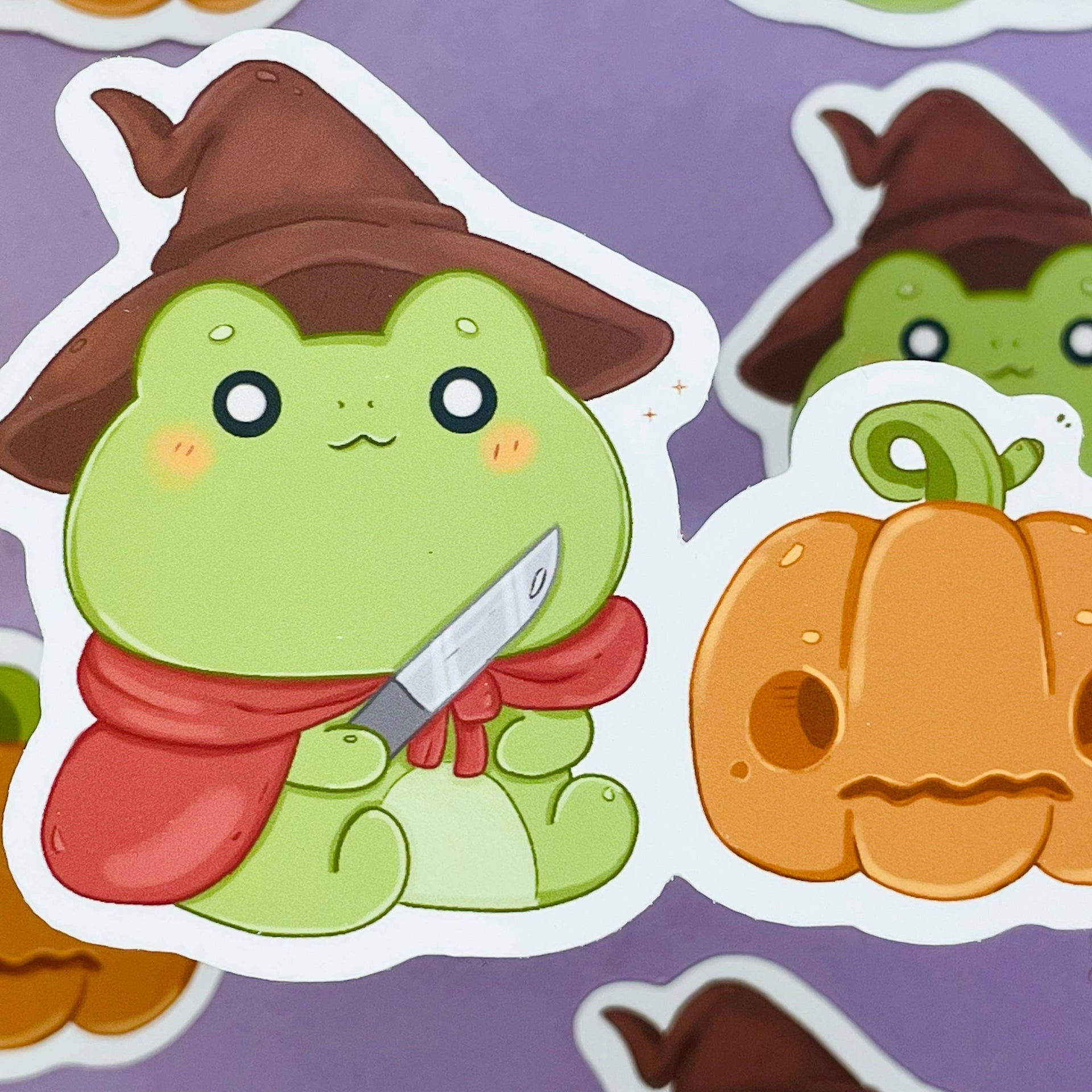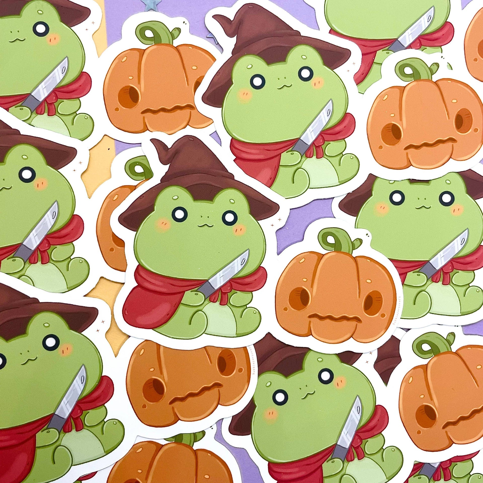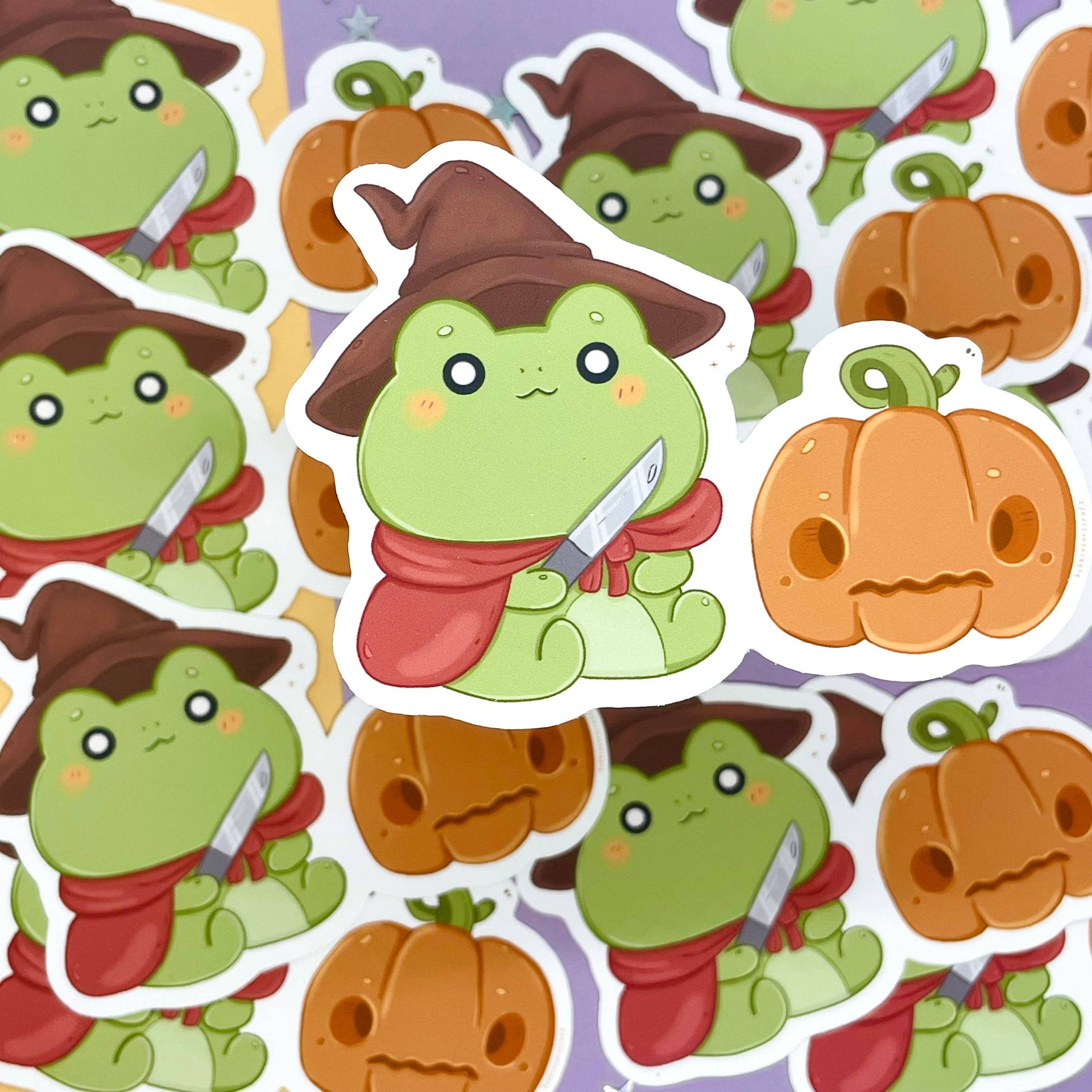 Questa rana di Halloween e la sua piccola amica zucca sono adesivi fustellati con finitura lucida. Illustrazione della rana dipinta a mano stampata su vinile resistente.