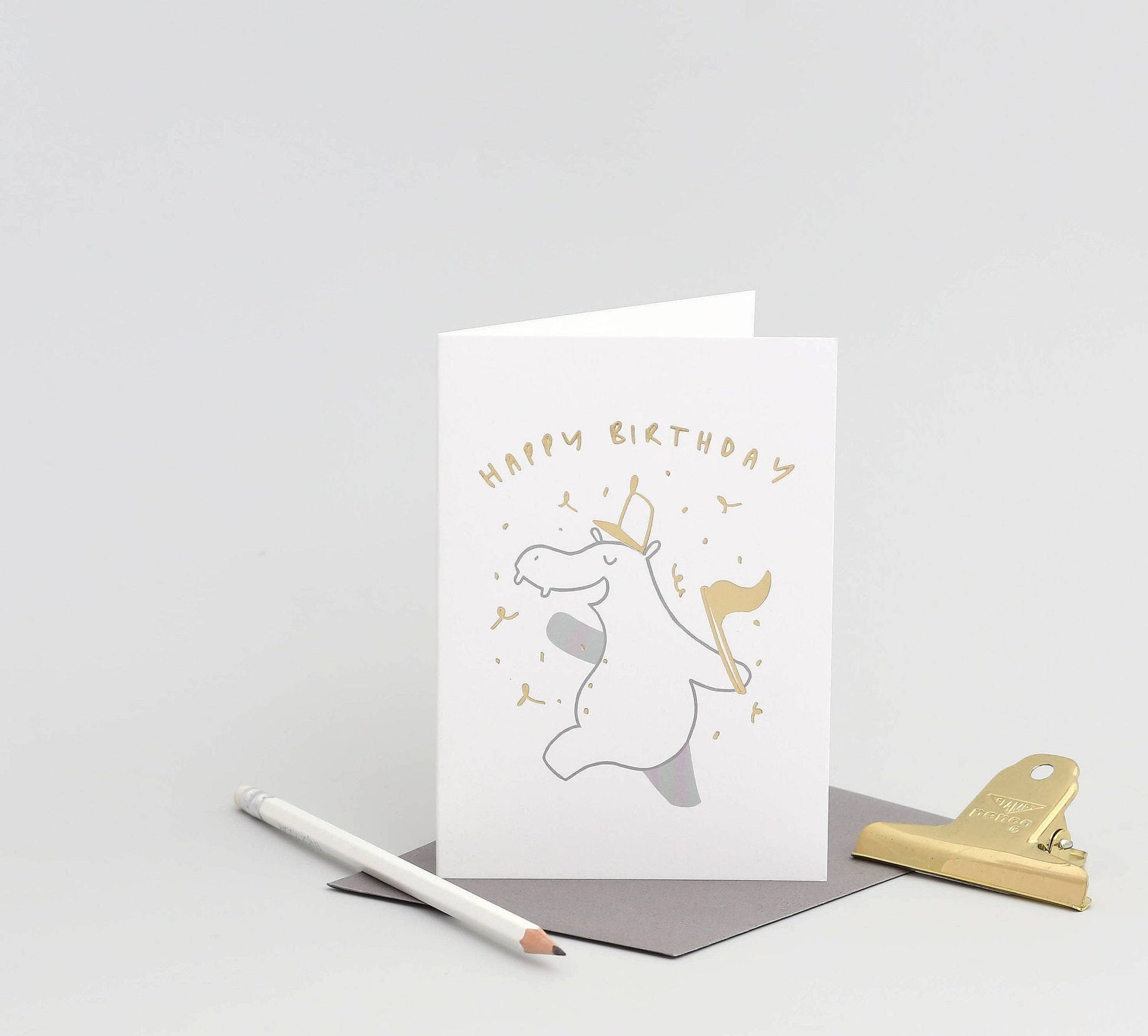 Un biglietto di auguri di compleanno per bambini semplice, audace e divertente scritto a mano con una divertente illustrazione di un ippopotamo in marcia.