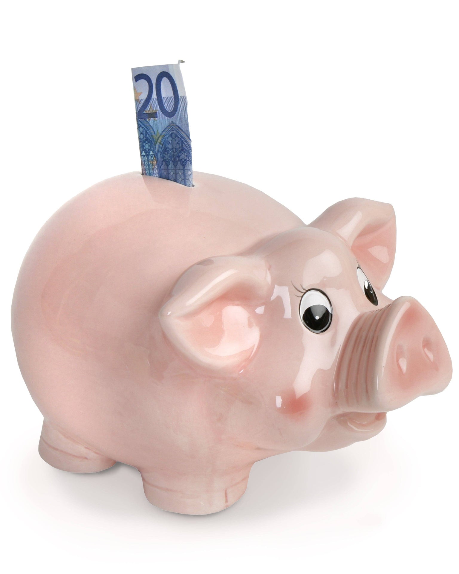 Jumbo tirelire XXL émaillée rose, 100 % céramique, bouchon en caoutchouc, en carton. Que ce soit pour un mariage, comme cadeau d'anniversaire, comme caisse à café ou pour les pourboires, la tirelire géante XXL décorative est parfaite pour réaliser de plus grands souhaits. Caractéristiques du produit XXL Jumbo tirelire * Dimensions : 24 x 16,5 x 16,5 cm * Matériau : 100 % céramique * Couleur : rose * Détails : les 4 pieds du cochon sont équipés de patins antidérapants, protégeant ainsi la surface de pose * Fermeture : avec bouchon en plastique, pour un retrait facile des économies * Exécution : la céramique émaillée protège la tirelire, réduit la rugosité de la surface et facilite ainsi le nettoyage * Conseil d'entretien : nettoyage avec un chiffon humide recommandé * Emballage : en carton d'expédition * Autre : le billet de banque illustré n'est pas inclus dans la livraison