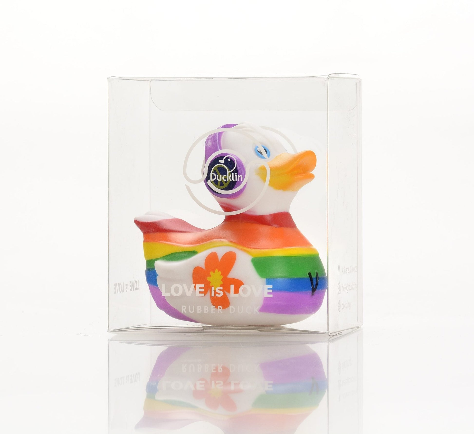 Denne spesielle badeanden som er dekket i fargene til regnbueflagget, vil garantert finne en eier!