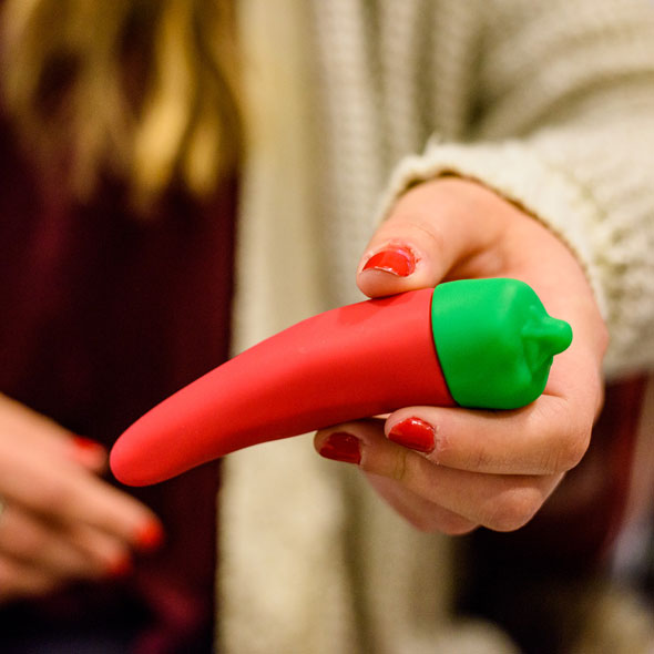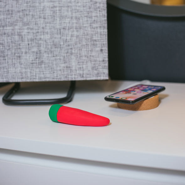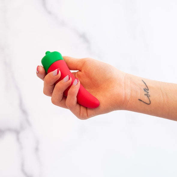Pris opp livet ditt med Chili Pepper-emojien! Denne vibratoren er en chilipepper-emoji som kommer til live. Selv om det ikke vil brenne deg, ikke bli overrasket når ting varmes opp på soverommet med denne lekens fleksible tips for ekstra nytelse. Den tilbyr ti innstillinger i vanntett design som kan brukes inn og ut av badekaret og i dusjen for de varme små tingene dine.