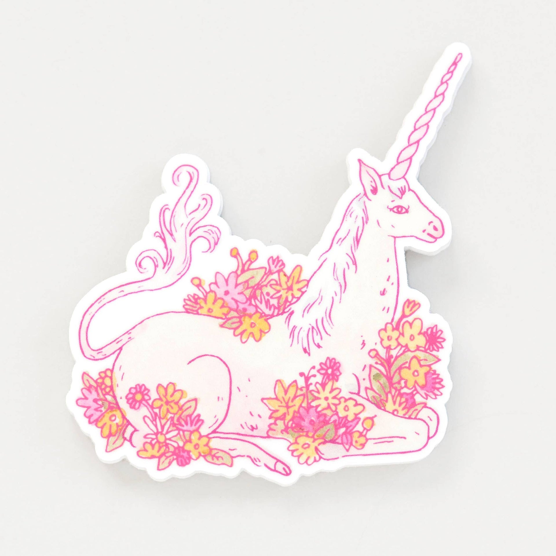 En vakker enhjørning som slapper av i blomstene. Disse klistremerkene har et førsteklasses belegg som beskytter dem mot eksponering for vind, regn og sol. Du kan til og med legge dem i oppvaskmaskinen og få dem ut som nye!