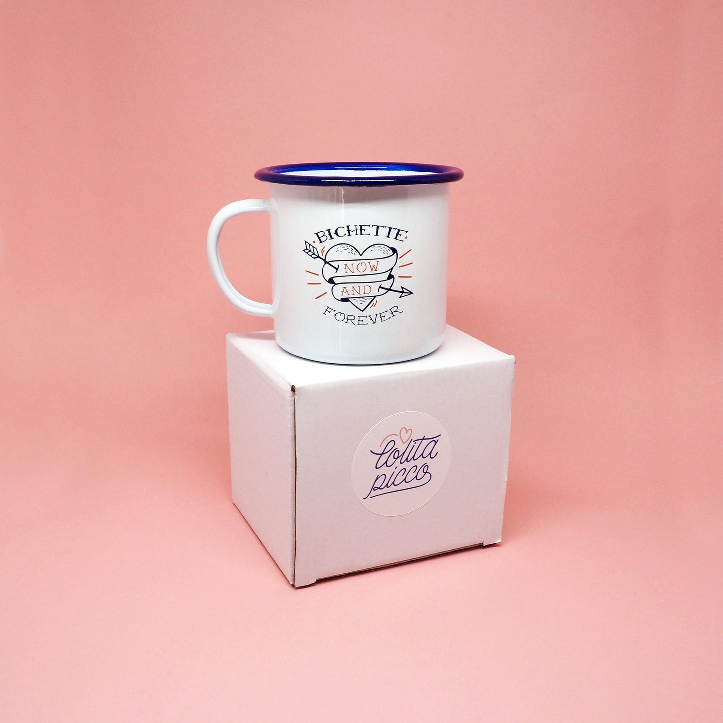 En stor favoritt på nettbutikken, Bichette forever-kruset er et must-ha for alle varme drikker. Kledd i hvitt, blått og en pen pastellrosa, hyller bokstavene og illustrasjonen de mest vintage tatoveringer... og til alle rådyr!