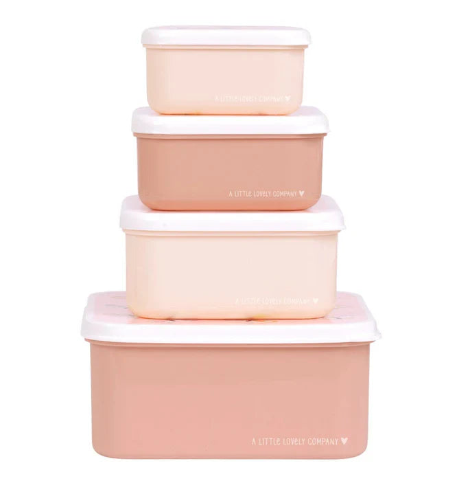 Denne lunsj- og snackboksen med rosa sommerfugltrykk er ideell å ta med på skolen eller på farten. Den består av fire bokser i forskjellige størrelser, enkle å stable og oppbevare.