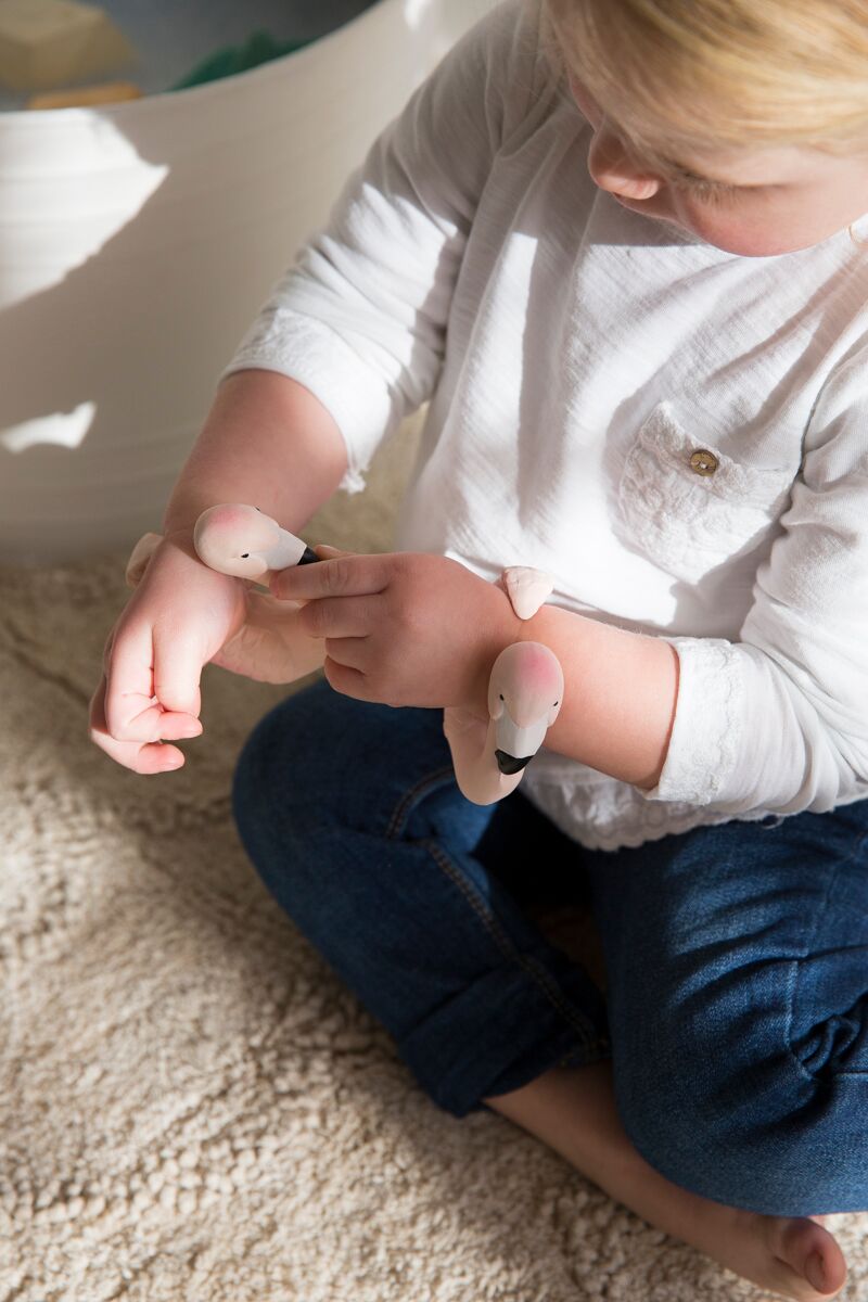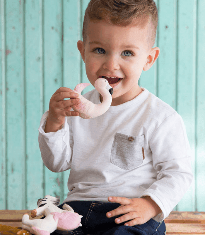 Sky the Flamingoer en dyreformet bitring som er perfekt for bruk som tannlege, badeleke og sanselek. Den er malt med naturlige pigmenter, 100% trygt for barn! Klar til å bæres på håndleddene til babyer og barn under hvert av deres eventyr!