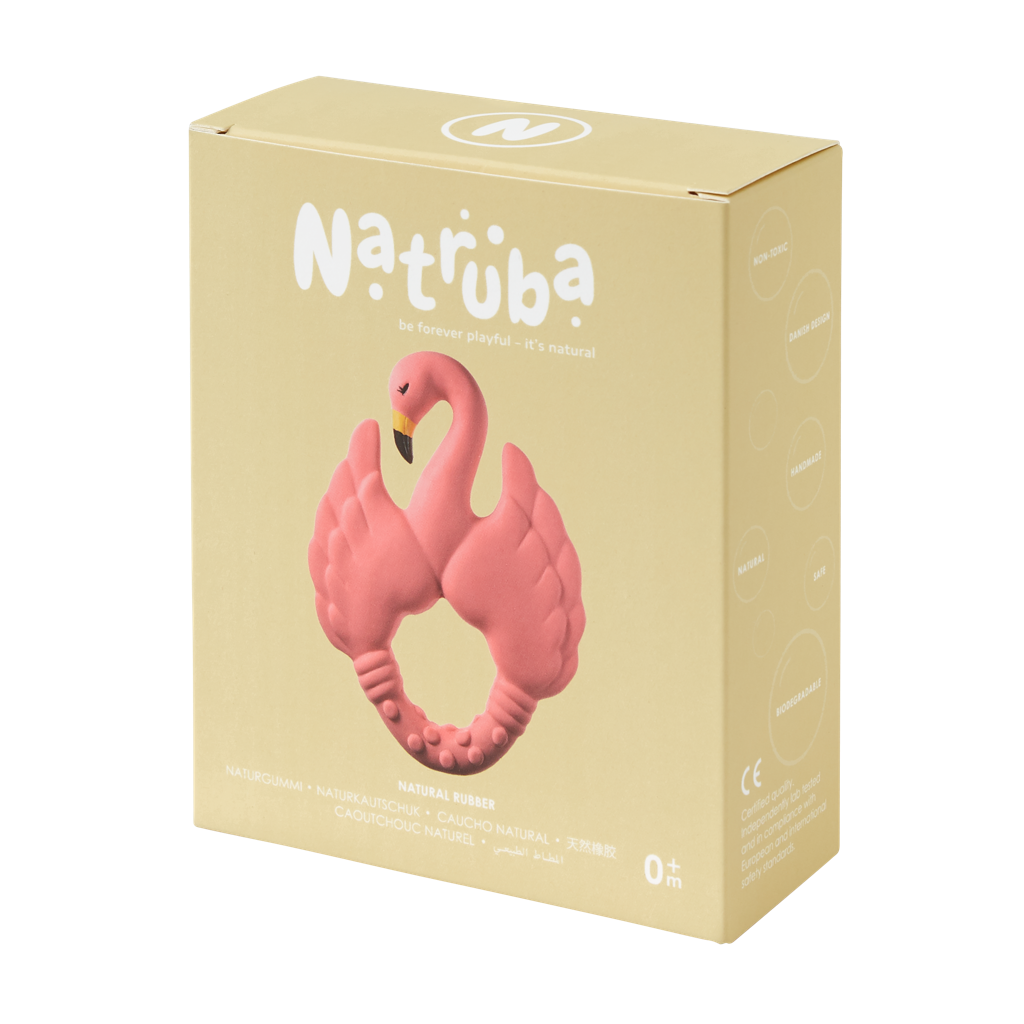 Velkommen til den rosa flamingoen som gir deg lyst til å spre vingene og fly inn i en verden av naturlig lek og fantasi! Flamingo Natruba er lett for små hender å gripe og en perfekt lindring for sårt tannkjøtt. Flamingoen har ulike overflater for sanselek og har både myk og hard naturgummi for å tilfredsstille alle stadier av vondt tannkjøtt. Den lyse fargen stimulerer barnets syn.