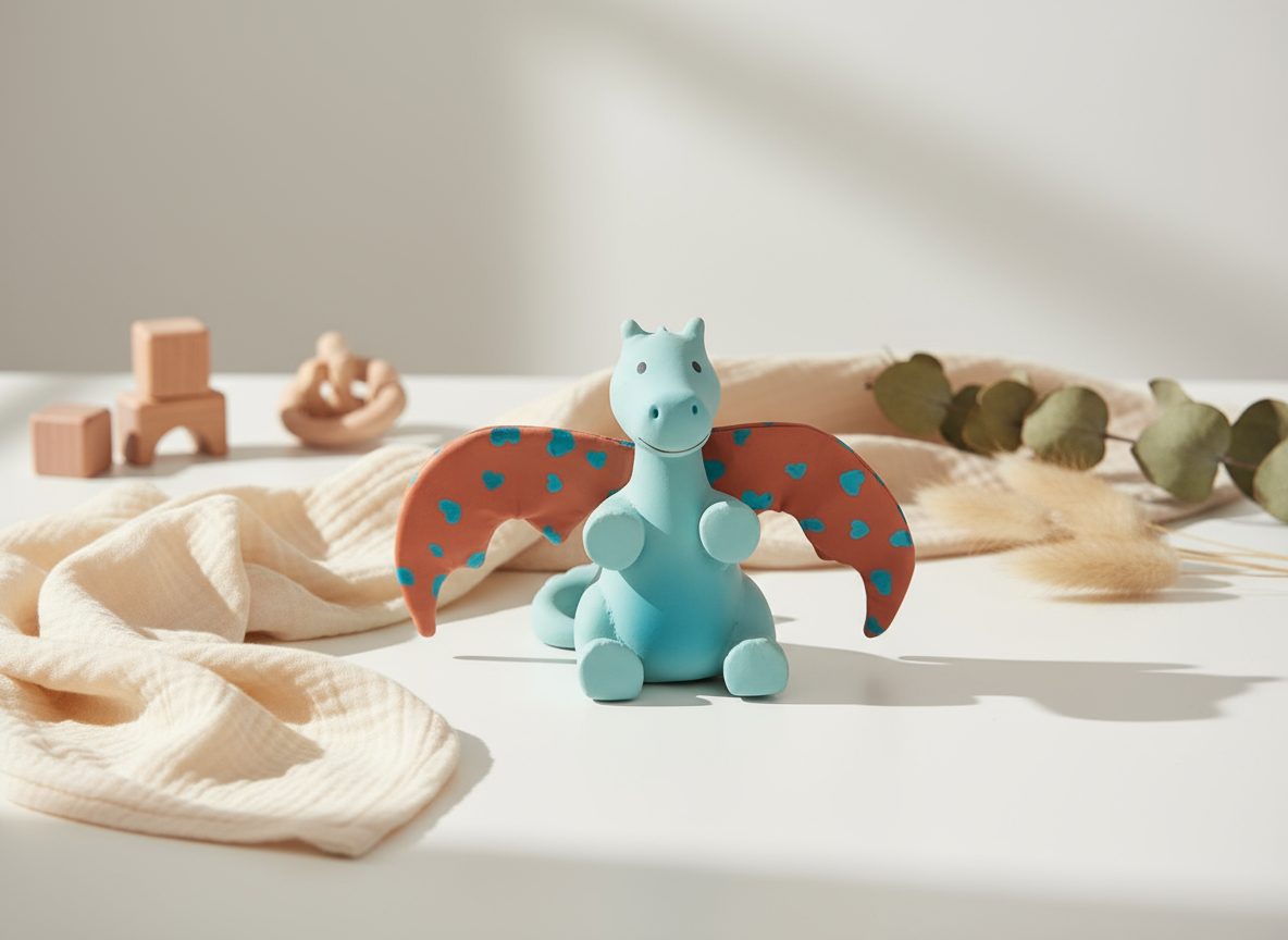 Dragon du lever du soleil - Hochet en caoutchouc naturel avec ailes à froisser dans une boîte