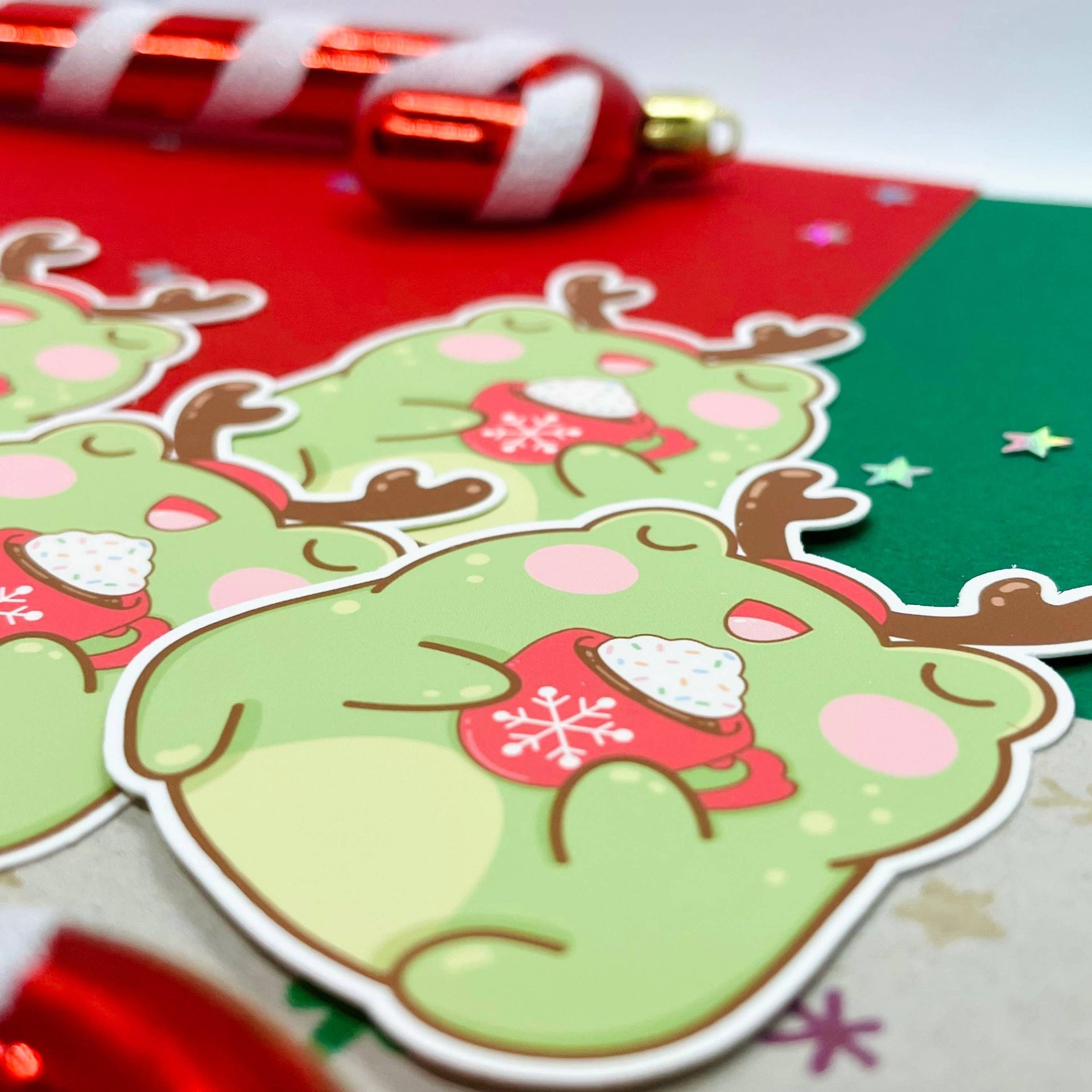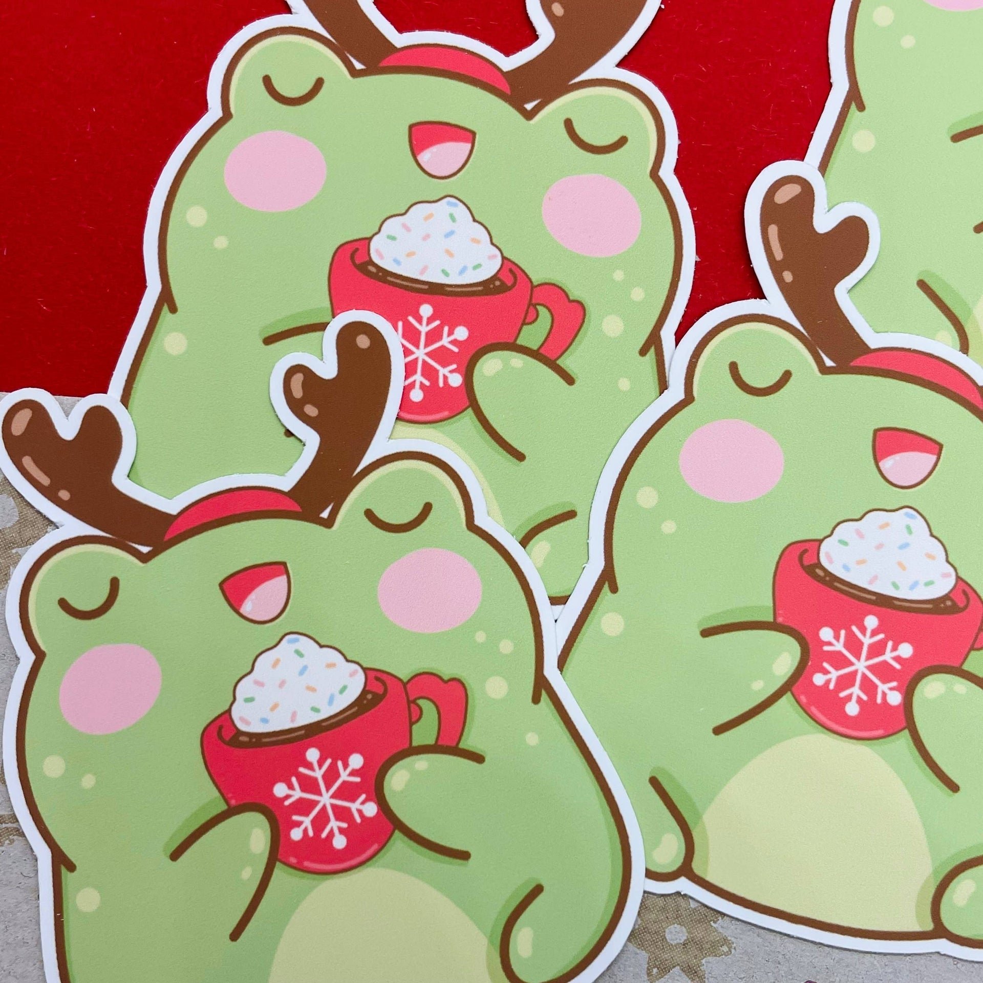Este sapinho é o presente de Natal ou adesivo perfeito para colocar em presentes embrulhados. Ele não se importa em terminar sua bebida de chocolate quente. Este é um adesivo recortado durável e à prova d'água com acabamento brilhante. Ilustração de sapo/rã pintada à mão e impressa em vinil.