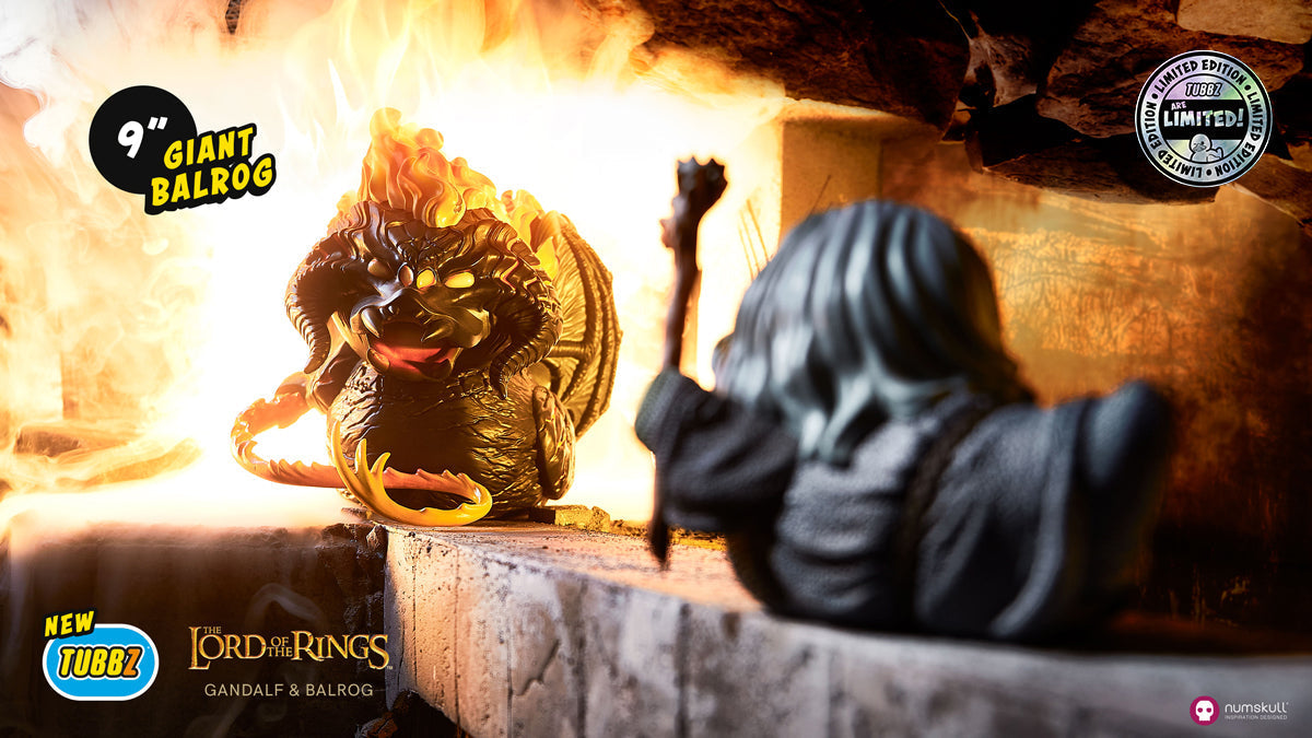 Não passarás, no lago, com o protetor de pato Gandalf (Não passarás) em sua pose icônica do filme "A Sociedade do Anel" com cajado e espada na mão. Vem em um impressionante display de banheira "O Senhor dos Anéis", este item colecionável único é ideal para os fãs da série estocarem!