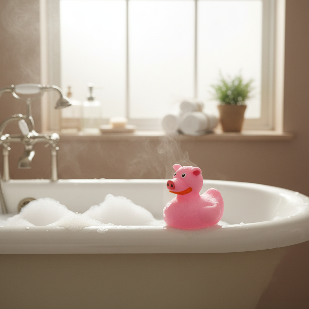 Quando nosso patinho nasceu, os médicos ficaram surpresos. Ele é rosado como um leitão e tem um bico como um pato magnífico. No mundo dos patos de borracha, ele é um dos exemplares mais macios e fofinhos. Nas horas vagas, o porquinho prefere a lama fresca e agradavelmente úmida, que não só protege contra os insetos, mas também proporciona uma pele maravilhosamente macia.