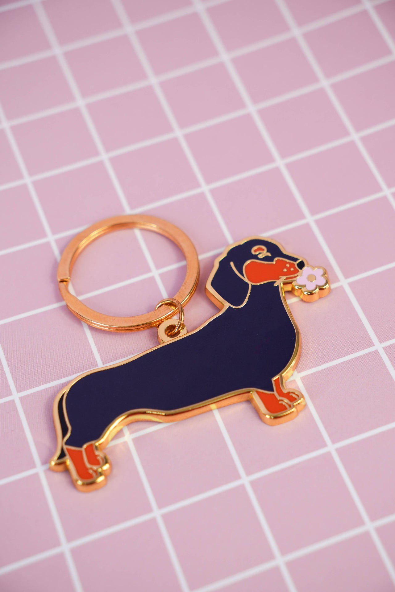 Attention chien chaud 🌸 Ce petit chien saucisse tout en longueur se balade fièrement avec sa fleur. Malicieux et attendrissant, il attire les regards et sème des sourires partout où tu passes.Un porte-clé qui apporte instantanément une touche fun et décalée à vos clés, sacs ou tote bags.